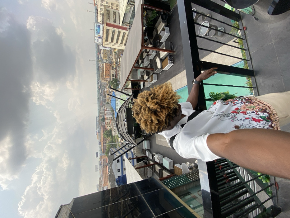 The image depicts an elevated view of a cityscape in Ikeja, Nigeria, from a rooftop lounge area under a partly cloudy sky. In the foreground, a male individual is partially visible, positioned in a selfie-style orientation with his left arm extended towards the camera. He wears a white short-sleeved collared shirt with a multicolored floral pattern on the lower half and light-colored trousers. His hair is light brown, voluminous, and curly. A black strap, likely from a bag, crosses his chest, and a black watch is on his left wrist. His right arm rests on a black metal railing. His face is obscured, angled downwards. Beyond the railing and immediately below, a turquoise-colored swimming pool or water feature is visible, bordered by the railing. The rooftop surface is dark grey. To the right, partial metallic outdoor furniture is visible. The midground features an outdoor lounge area on the same rooftop. This area is furnished with multiple sets of light-colored (likely white or beige) cushioned sofas and tables, arranged beneath two distinct dark-colored overhead shelters: one arched and one flat. Green foliage borders some sections of the lounge. The background reveals a dense urban landscape of Ikeja, Nigeria, stretching to the horizon. Numerous buildings of various heights and architectural styles are present, predominantly multi-story structures. Key features include multiple distant billboards, one prominently displaying "BLUE IS HERE" on a taller building. Roads and vehicular traffic are discernible between structures. The sky is dominated by scattered cumulus clouds, indicating partial overcast conditions.