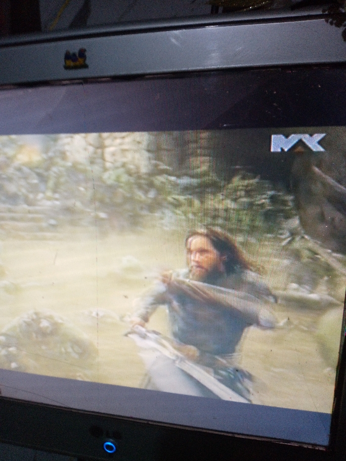 television screen displaying a scene from a film. A bearded man with long hair is wading through a murky river. He is wearing a light-colored tunic and holding a sword at his side. The background suggests a rocky, wooded area. An "MX" logo is visible in the top right corner of the screen. A small sticker is on the top left corner. The screen has some minor imperfections.