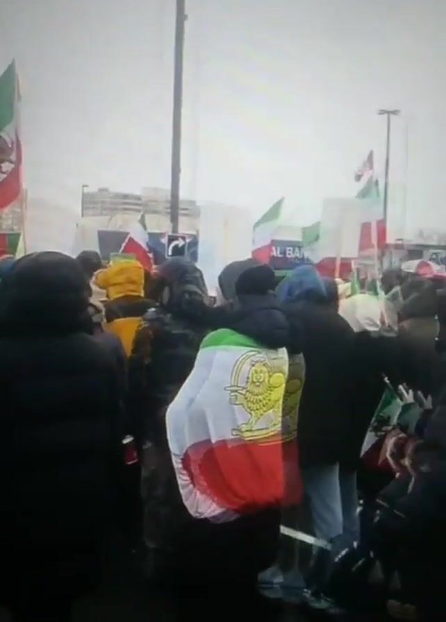 crowd of people walking, many carrying flags. The flags appear to be Iranian flags that include a lion and sun emblem. The event seems to be taking place outdoors on what looks like a street with light poles. The day appears overcast. Most people in the crowd are wearing winter coats or hats.