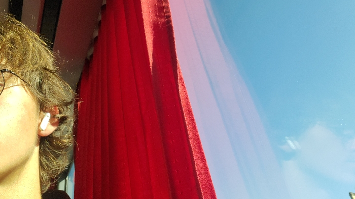 A cropped, angled interior image shows the left side of an individual's head, featuring wavy light brown hair, dark-rimmed glasses, and a white wireless earbud inserted into the left ear. To the right, a pleated red curtain hangs, partially obscuring a window. Beyond the curtain and through the window, a clear, bright blue sky is visible, with faint reflections on the glass surface. A dark, angular structure, possibly a ceiling beam, is present in the upper left corner. The scene suggests a person inside a structure, possibly a vehicle, looking towards the exterior. Location: Unknown, Unknown.