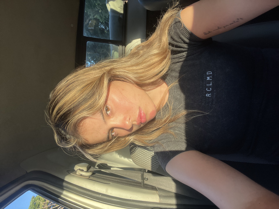 A young female individual is depicted in a close-up, waist-up portrait taken inside a vehicle