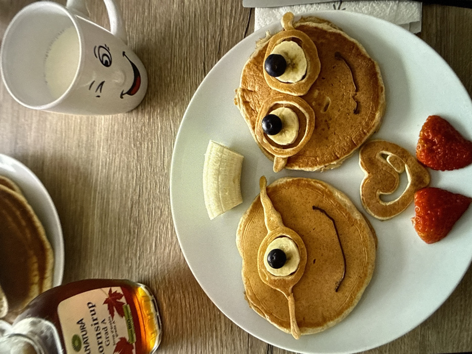 - "Two character-themed pancake stacks sit on a white plate beside a halved banana and two cut strawberries" by FM-z8OuP2, licensed under CC BY 4.0
