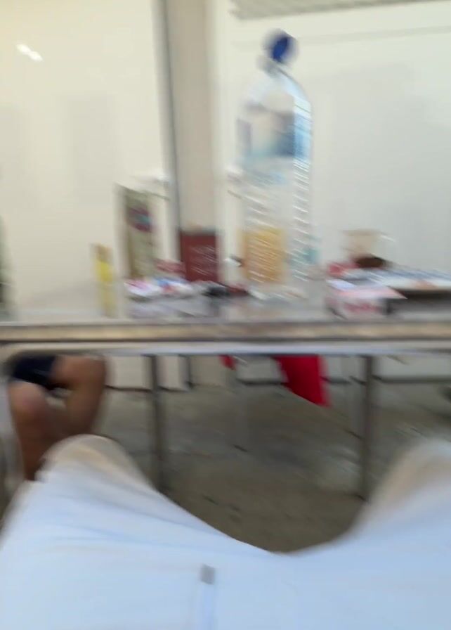two men in an outdoor setting, possibly a patio. One man is seated, wearing a green hooded sweatshirt and shorts. The other man, wearing a black t-shirt and shorts, stands near a glass table with various items including a large water bottle, a carton of Marlboro cigarettes, a coffee mug, and a tin can labeled "INSPIRE EXPIRE RELAX." The standing man kicks his leg up and to the side, appearing to jest around. The setting includes a white wall with a window, and the camera appears to be held by a third person seated at the table.
