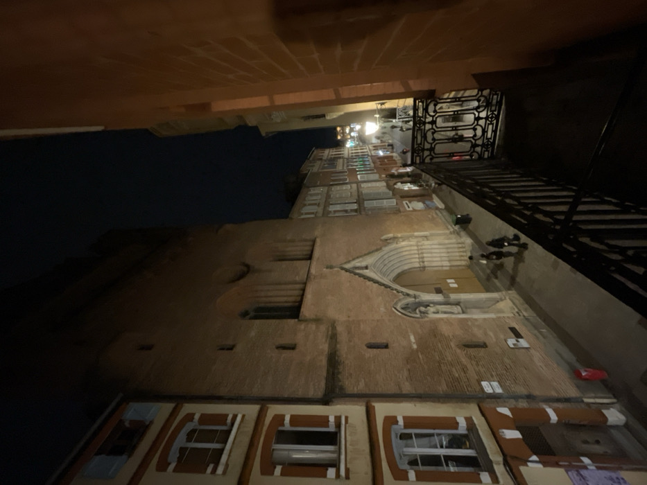An upward-angled view shows an old brick building at night. Several windows with rounded tops are visible along the bottom, and the facade includes an arched doorway with detailed carvings. A dark balcony with ornate metal railings runs along the side. The top portion of the building features many windows, and lights are visible. A section of a brick ceiling is at the top of the image.
