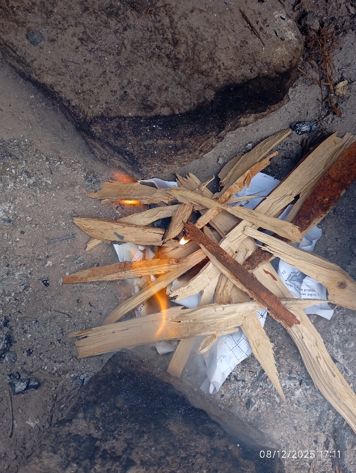 An overhead view captures a small, active fire contained within an informal ground pit in Ngong ward, Kenya. The fire consists of a pile of dry wooden splinters and crumpled white paper, from which several small flames emanate, consuming the combustible materials. The ground surrounding the fire is composed of light greyish-brown soil mixed with ash and dark charred remnants, suggesting previous or ongoing burning activity. In the upper left quadrant, a larger, dark, possibly damp or stained area of earth or rock is visible, contrasting with the lighter soil. No individuals are present. A digital timestamp "08/12/2025 17:11" is overlaid in the lower right corner.