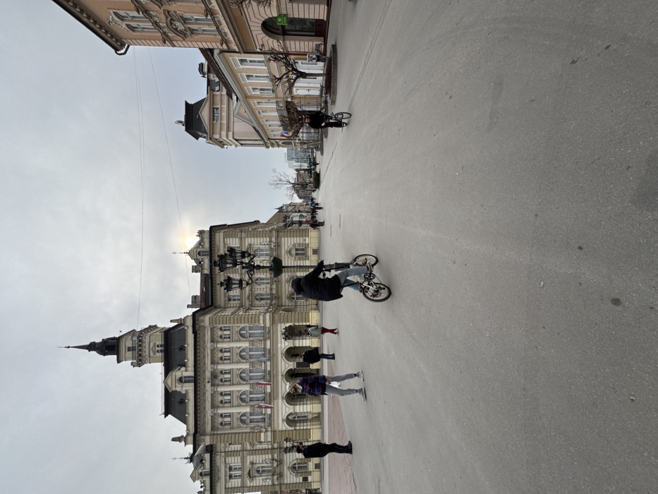 The scene depicts a pedestrianized urban environment in Novi Sad, Serbia, specifically Trg Slobode (Liberty Square) and the beginning of Zmaj Jovina Street. The Novi Sad City Hall, a large, ornate Neo-Renaissance building with a prominent central tower and spire, dominates the left background. Its facade is a light, likely cream or pale yellow color, featuring multiple windows, balconies, decorative elements, and several flags hanging from upper stories. The ground is a light gray paved surface. In the mid-ground, slightly left of center, a person wearing a dark hooded jacket and blue jeans cycles a small-wheeled bicycle away from the camera. Further down the street on the right, a second individual in dark clothing also cycles a bicycle away from the camera. Several pedestrians are present. On the left, closer to the camera and near the City Hall, a person in a purple and white checkered jacket, light gray pants, and white sneakers walks left, holding a white object. To their left, another individual in a dark coat stands facing right. Additional pedestrians are visible near the City Hall's ground-level archway, further down the street, and in the distance. An ornate black streetlight with multiple lanterns stands in front of the City Hall, to the right of the foreground pedestrians. The right side of the street is lined with multi-story buildings, predominantly light-colored (beige/pink), featuring various architectural styles, balconies, and ground-level establishments. Bare deciduous trees are planted along the street. The sky is overcast, with a hazy, muted sun visible through the clouds above the buildings to the right of the City Hall tower.