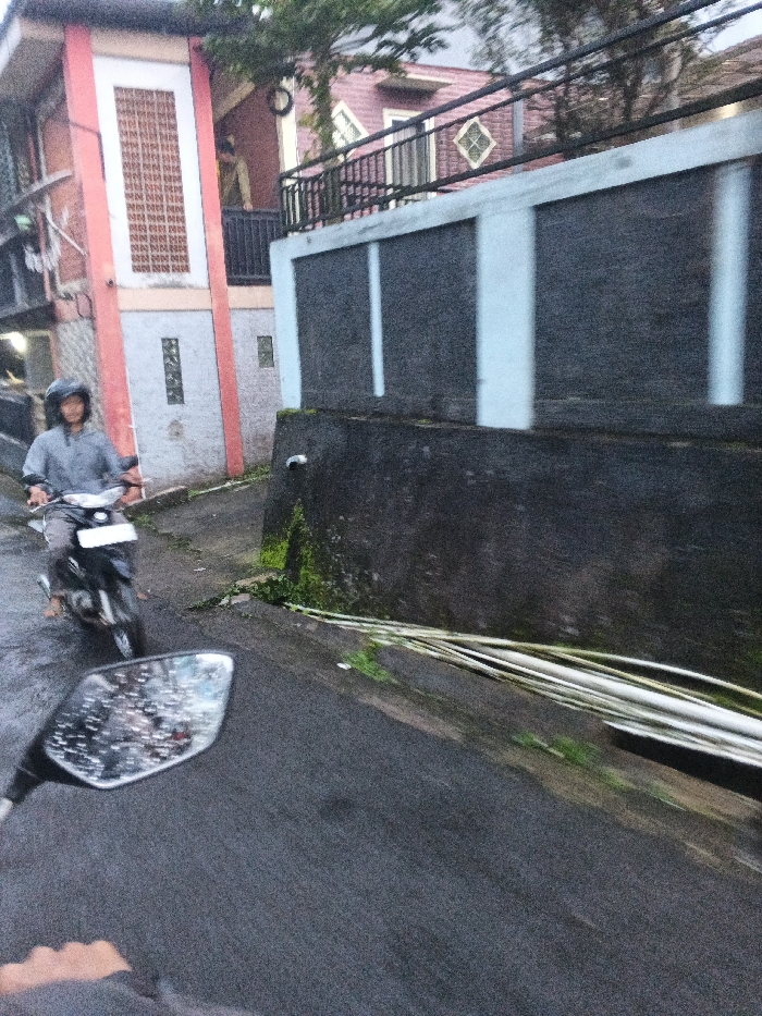 This image depicts a street scene in Munyati, Zimbabwe, captured from the viewpoint of a motorcycle. In the immediate foreground, the upper portion of a black motorcycle rearview mirror is visible, speckled with water droplets, reflecting a blurred sky and road. A human hand, partially gloved or covered, holds a handlebar at the bottom left. In the mid-ground, a male individual, wearing a dark full-face helmet and a grey long-sleeved shirt, operates a dark-colored motorcycle. His bare feet are visible. He is positioned on a wet, dark asphalt road, moving forward and slightly to the left of the camera's perspective. The background consists of residential structures and natural elements. To the left, a multi-story building features reddish-orange, white, and grey facade sections, with a vertical brown slatted vent or window and an external air conditioning unit. To the right, a dark grey retaining wall, capped with a lighter blue-grey coping and vertical decorative strips, runs parallel to the road. Green moss adheres to the lower part of this wall, and a white pipe protrudes horizontally near its base. Behind and above this wall, a two-story building with a reddish-pink exterior is visible. This building features a balcony with a black metal railing, where a person in a light-colored long-sleeved shirt is standing. A diamond-shaped window with a grid pattern is also visible on its upper facade. Trees are present in the background, and several light-colored, long, thin objects (possibly pipes or bamboo) lie on the ground adjacent to the retaining wall on the right. The ambient lighting suggests an overcast sky.