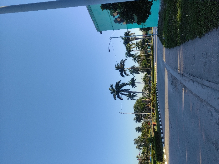 A sunny scene shows a road lined with palm trees and greenery. A sidewalk runs parallel to the road. Above, a clear blue sky dominates the view. A building with a green and blue mural is visible. The image is oriented sideways, with the sky taking up the majority of the frame. A light pole is visible on the left edge.