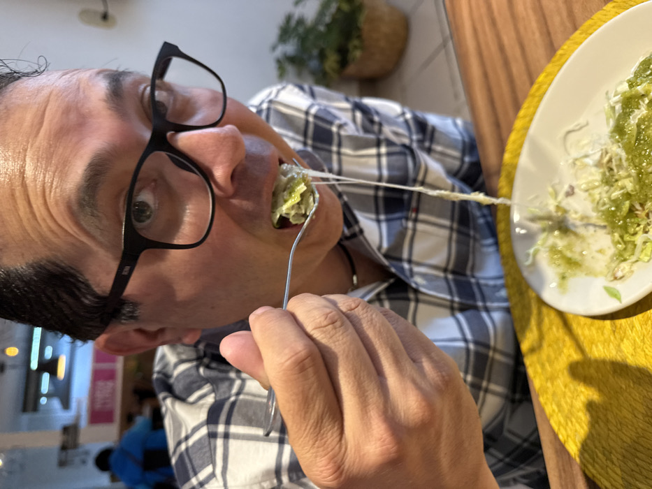A man with glasses holds a forkful of green food, possibly a salad, close to his mouth. A strand of cheese or sauce stretches from the fork back to a partially eaten plate of the same food. The man is wearing a plaid shirt. A plant in a woven basket is visible in the background. The plate sits on a yellow placemat.