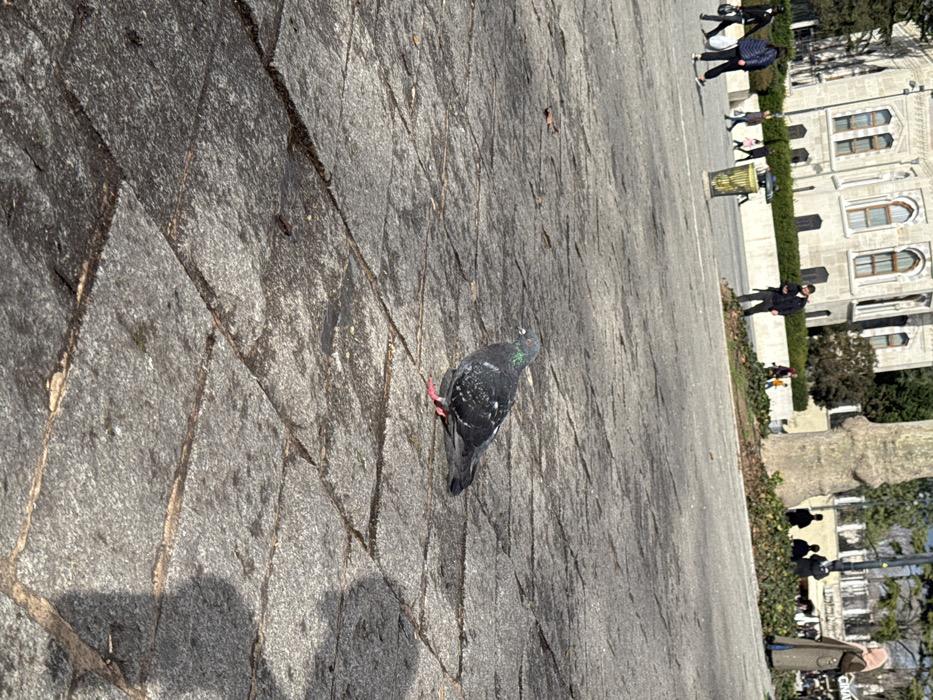The image depicts a public square in Istanbul, Turkey, identifiable by the distinctive architectural style of the large stone building in the background, likely associated with Istanbul University's Beyazit Campus, adjacent to Beyazit Square. In the foreground, a single rock pigeon (Columba livia) stands on a paved surface composed of large, irregular grey stone slabs. The bird displays grey and black plumage, with iridescent green and purple feathers visible on its neck, and reddish-pink feet. Small brown leaves are scattered on the moist-appearing pavement. A human shadow is cast across the lower right portion of the foreground. The midground shows a broad, open paved area. On the left, two individuals walk from left to right: one wears dark clothing and carries a dark bag, while the other wears dark clothing and a light-colored backpack. A yellow, vertically slatted metal trash bin is positioned center-left. Further right, a man in a dark jacket and trousers stands beside a low, landscaped mound, looking at a mobile phone. A large, mature tree trunk, possibly a plane tree, is prominent on the mid-right, partially obscuring the background. Beyond this tree, a woman in a long brown coat and a light brown headscarf stands facing right. Several other indistinct human figures are visible in the distance. The background features a grand, multi-story stone building characterized by its light coloration, ornate arched windows, and classical architectural elements. Green trees and foliage are visible surrounding and behind the building. The sky is clear and blue.