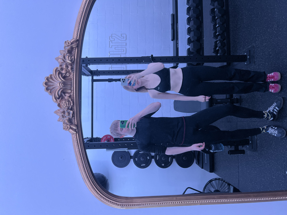 A mirror selfie captures two individuals in a gym setting. The reflections show one person in a black sports bra and pants, while the other wears a long-sleeved black shirt and pants. Both are holding phones, seemingly taking the picture. Gym equipment is visible in the background, including weights, a squat rack, and a fan. The mirror is ornate with a gold-colored frame, adding a decorative touch to the fitness environment.