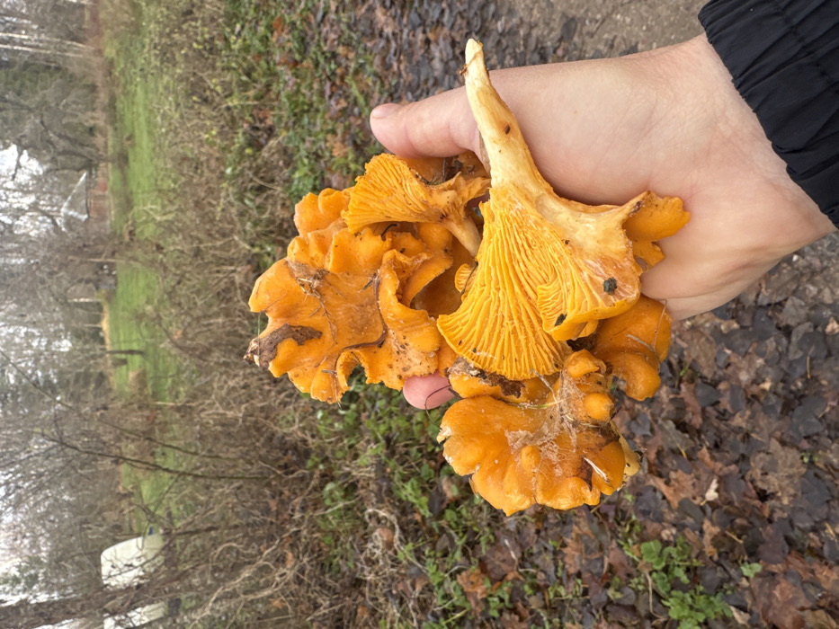 - "A right human hand, visible from the wrist, holds a cluster of bright orange-yellow chanterelle mushrooms, approximately 10-15 individuals, against a natural outdoor background in Strigailiškis, Lithuania" by FM-12bcD2, licensed under CC BY 4.0