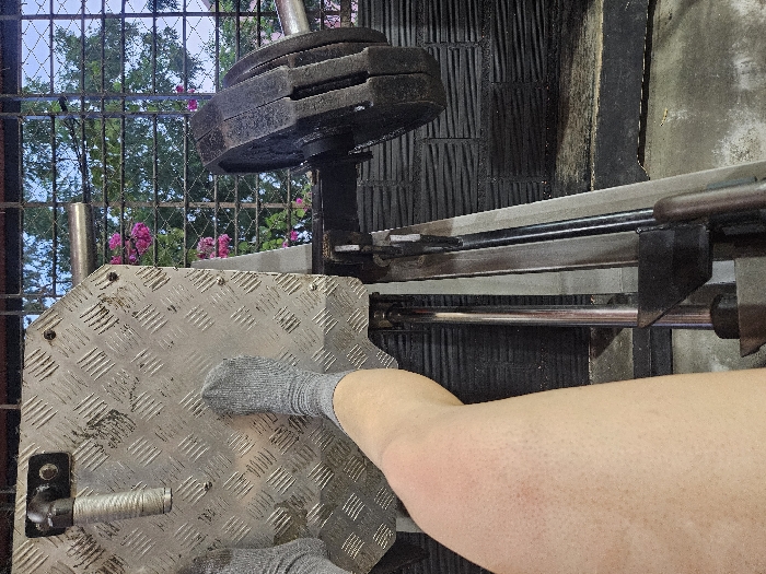 A person wearing gray socks uses a leg press machine with stacked weights. The machine's textured metal footplate is visible, as are the polished steel bars and black support structures. Beyond the machine, a glimpse of trees and pink flowers can be seen through a metal fence. The person's pale leg is positioned near the footplate, showcasing part of their skin.
