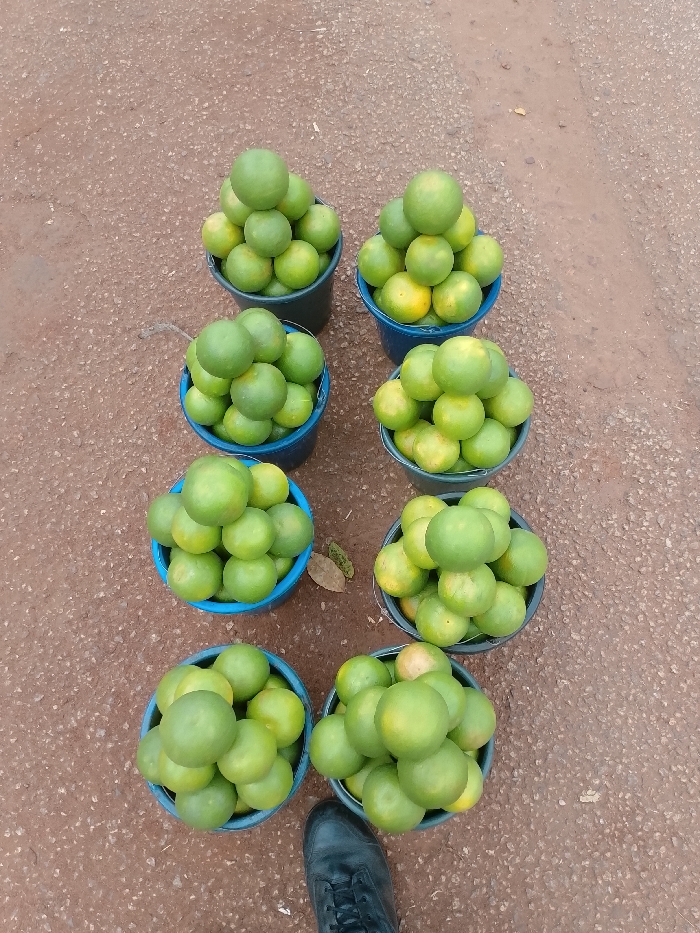 The scene is observed outdoors in Ejule, Nigeria. Ten plastic buckets are arranged on a reddish-brown, granular ground surface. Each bucket contains a mound of green and yellowish-green citrus fruits, likely oranges, with many stacked to form small pyramids atop the buckets. Five of the buckets are dark blue or black, and five are light blue. The fruits display a range of ripeness, indicated by variations in green and yellow hues. Scattered dried leaves are visible on the ground between some of the containers. In the lower-right foreground, the toe and lacing of a black boot are visible, indicating the presence of an individual. The arrangement suggests a roadside produce display or market stall.