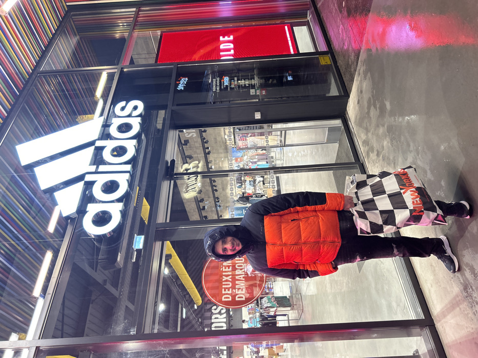 A rotated outdoor shot shows an Adidas store front. The bright Adidas logo is visible on the left. A man stands in front of the store, wearing a puffy orange and black jacket with the hood up, holding a black and white checkered "New York" shopping bag. Through the glass, store interiors and sale signs are visible, including one that reads "DEUXIEME DEMARQU". The wet pavement reflects light.