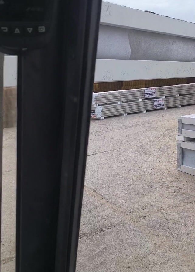 From inside a forklift, the operator surveys the warehouse yard. There are bundles of Rollpanel insulated panels, stacks of metal mesh panels, and other panels stored around the yard. The forklift moves forward.