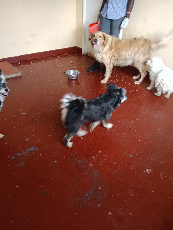 An indoor scene depicts four dogs and one person within a room with light beige walls and a reddish-brown floor. The specific location within Nairobi, Kenya, is not discernible from the image content. **Environment:** The room features a painted reddish-brown floor, which appears worn and is scattered with numerous light-colored particles, consistent with dry pet food kibble. Darker, irregular marks, possibly paint spatters or wear, are also visible on the floor. A red skirting board lines the base of the light beige walls. A white door frame is partially visible on the right. **People:** One individual is partially visible on the right side of the frame, standing near the door. The person has dark skin, wears a light blue and white striped short-sleeved shirt, grey trousers, and dark shoes. A white glove covers the person's right hand, while the left hand holds a red plastic bucket. **Subjects (Animals):** 1. **Golden Retriever:** A large, medium-haired, golden-colored dog stands near the center-right, facing the viewer with its tongue slightly out. Its tail is blurred, indicating movement. 2. **Small White Dog:** A small, fluffy, long-haired white dog is positioned behind the Golden Retriever, on the far right, facing away or slightly to the right. 3. **Black and White Fluffy Dog:** A medium-sized, fluffy black and white dog stands in the foreground, center-left, facing away from the viewer. 4. **Partial Dog:** A small portion of a black and white fluffy dog's head and muzzle is visible on the far left edge of the frame. **Objects:** A silver-colored metal pet bowl containing a small amount of liquid (likely water) rests on the floor towards the center-left. A rectangular, flat brown object, possibly wood or a mat, lies against the left wall. The red bucket held by the person appears empty or partially filled. **Actions and Interactions:** The individual stands among the dogs, holding the red bucket. The Golden Retriever appears attentive, looking towards the viewer or the person. The presence of scattered kibble and the metal bowl suggest recent or impending feeding activity. The person's attire and the bucket indicate a caretaking role within an animal housing or care facility.