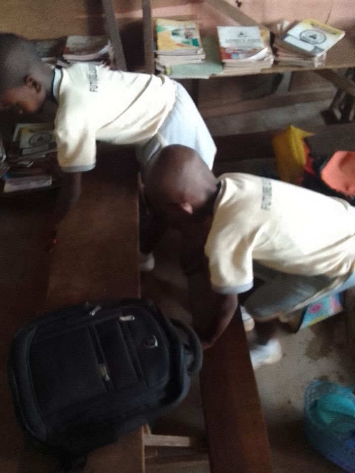 Two boys in matching uniforms lean over a wooden bench, appearing to search for something. A black backpack rests on the bench in the foreground. A shelf behind them holds stacks of books. A yellow bag and other items are scattered on the floor, including a turquoise bag. The environment suggests a classroom or school setting.