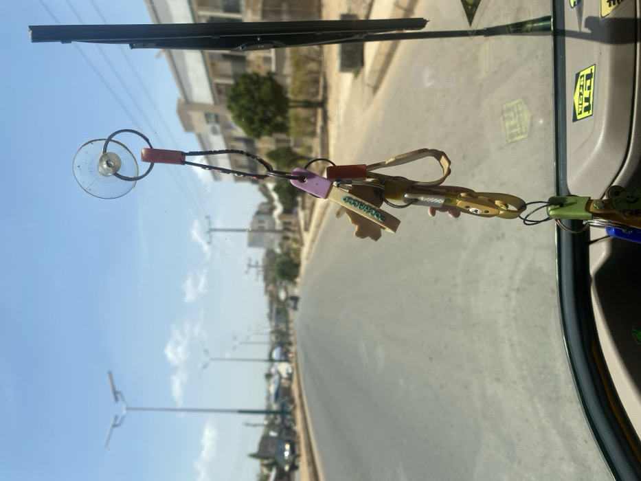 The image depicts a daytime scene from within a vehicle looking out onto a wide road in Jos, Nigeria. In the immediate foreground, a cluster of keychains hangs from a suction cup attached to the vehicle's front windshield. Specific keychains include a light brown, animal-shaped piece with "POSHCOCO" inscribed in green, and a light pink rectangular item. A section of the vehicle's dark-colored dashboard, bearing a yellow sticker with "TEPA" text, is visible at the bottom of the frame. A black windshield wiper blade occupies the right periphery. The external environment shows a two-lane asphalt road, without visible lane markings, extending into the distance. Streetlights with Y-shaped solar panel configurations line both sides of the road, alongside power poles with overhead lines. Sparse, low-lying vegetation and small trees are present along the roadside. In the midground and background, light-colored, multi-story buildings, consistent with residential or commercial architecture, flank the road. A single vehicle is faintly visible in the far distance. The sky is clear blue with minimal scattered clouds. No pedestrians or other active subjects are discernible on the road or sidewalks. Atmospheric haze is present towards the distant horizon.