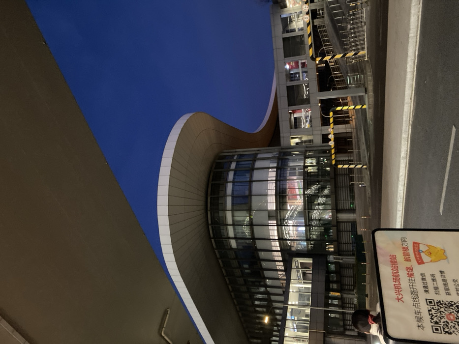 modern architectural structure with a curving roofline against a dark blue sky. Adjacent to it is a glass-walled building. In the foreground, a sign with Chinese characters indicates a bus stop ("Daxing Airport Terminal Station"), providing directions to Yufa and the Air Traffic Control Tower. The sign also includes a QR code for accessing route information via WeChat.
