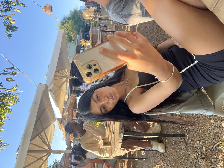 The image depicts an outdoor establishment in Kfar Ruth, Israel, during daylight hours, characterized by clear blue skies and bright sunlight. In the immediate foreground, a young woman with long, dark hair, wearing a black spaghetti-strap dress with white trim, is seated. She holds a gold-colored smartphone, equipped with a multi-lens camera system, in her right hand, pointing it towards herself to take a selfie. She has a subtle pouting facial expression and wears a silver bracelet on her left wrist and a necklace with a small blue pendant. A light-colored jacket is draped over her chair. Behind her, to the left, a man with dark skin and braided hair is seated at a round wooden table. He is wearing a beige long-sleeved shirt and brown pants, with white sneakers. Two glasses containing dark beverages with straws are on his table. He is looking to his left, away from the camera. The background shows a casual outdoor setting with multiple patrons, though most are out of focus. Several large white parasols provide shade over other rustic wooden tables. A straw-thatched umbrella is also visible. Further back, a structure resembling a food truck or permanent food stall is present. Decorative wicker lanterns hang from overhead wires. The ground is covered with light-colored gravel. Trees and foliage are visible against the clear blue sky, particularly in the upper portion of the frame.