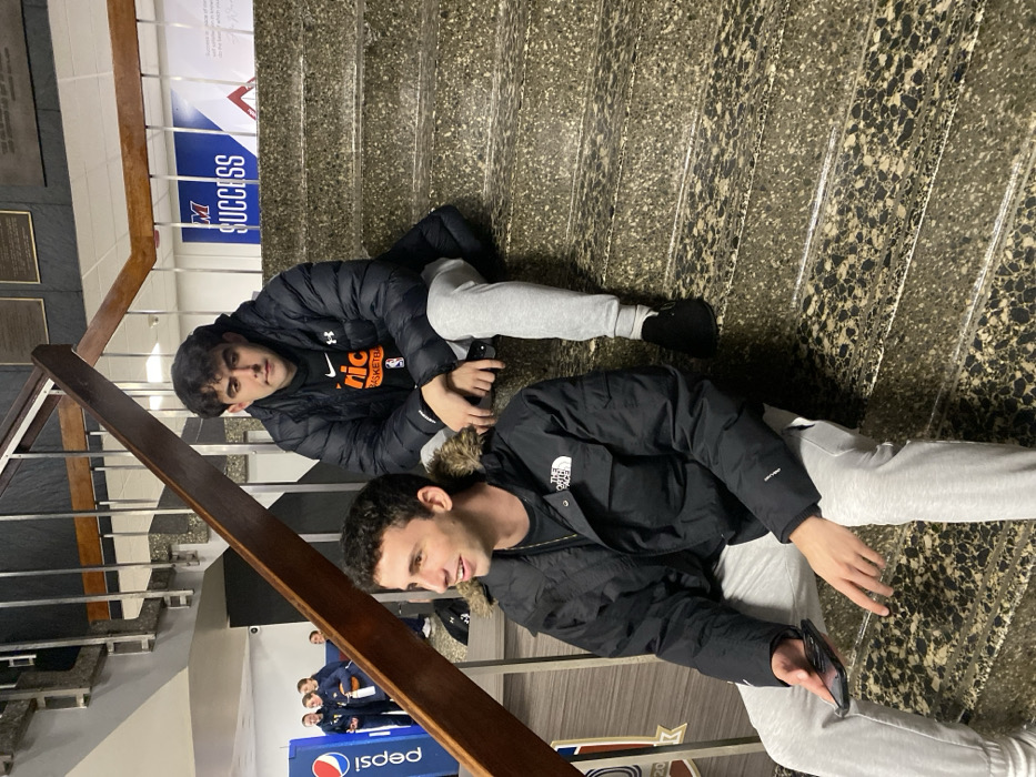 Two young men are sitting on a set of marble stairs inside a building. The man closest to the camera wears a black North Face jacket with a fur-lined hood and grey sweatpants. He is holding a phone. Behind him, the second man also wears a black jacket, paired with grey sweatpants and black shoes. A dark wooden railing is present in the foreground. A Pepsi advertisement and a banner for "Success" are visible along the wall.