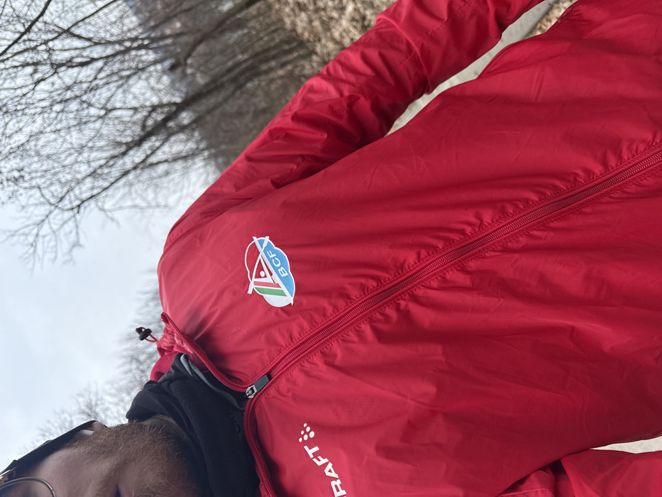 A male individual is depicted in a close-up, partial view, primarily from the chest up and to the left of the frame. He has a beard, wears glasses, and a dark beanie or cap. He is dressed in a red zippered jacket, beneath which a black neck gaiter or collar is visible. On the upper left arm/shoulder area of the jacket, the white text "CRAFT" is partially discernible. On the left chest area of the jacket, a logo is present, featuring a design with vertical green, white, and red stripes, an arrow-like motif, and the blue letters "BCF". The background consists of a natural, wooded environment with bare deciduous trees and branches under an overcast sky, indicating an outdoor setting, likely on a dirt or natural path with sparse ground cover, in Pancharevo, Bulgaria.