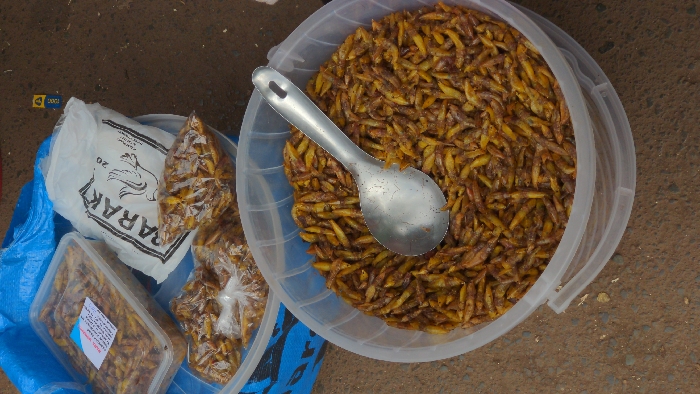 A bucket brimming with fried grasshoppers, their golden-brown bodies overlapping, features a large metal spoon. Next to the bucket is a bag labeled "Baraki" and some clear plastic containers and bags also filled with grasshoppers. All of this sits on a blue surface, likely a tarp, on what appears to be a concrete or asphalt ground. The grasshoppers seem to be prepared for sale.