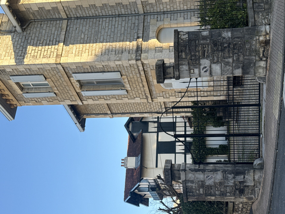 The scene depicts a residential street in Biarritz, France, under a clear blue sky and strong sunlight. In the immediate foreground on the right, a multi-story building constructed of light-colored, cut stone blocks stands prominently, its corner brightly illuminated. This building features multiple windows with light grey, closed louvered shutters. To the left of this structure, a black wrought-iron gate with pointed finials, appearing slightly ajar, provides access to a property. The gate is flanked by two stone pillars. The pillar on the left, made of darker, rough-hewn stone, has the word "VILLA" engraved on its upper capstone. The pillar on the right, constructed of similar stone, displays the word "SABEL" on its upper capstone, with the number "20" affixed below it, and a small, circular, dark-on-light emblem further down. Behind the gate and to the left, a second residential building is visible. This structure features white stucco walls with dark timber framing, a reddish-brown tiled roof, and a white chimney. It includes a balcony with dark railings on an upper level and windows with dark green shutters. Sparse, bare tree branches are visible behind the left pillar, and green bushes line the properties behind the gate and the right pillar. A paved sidewalk or curb is present in the lower foreground. No people, animals, or observable actions are depicted in the scene.