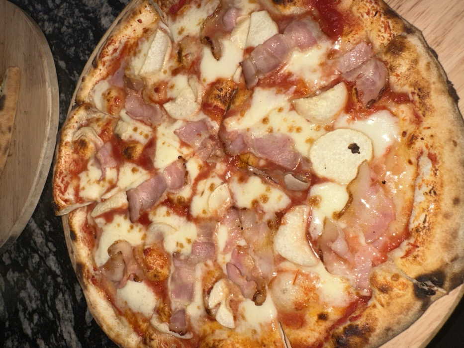 A freshly baked, round pizza occupies the center foreground, resting on a light wooden pizza peel or serving board. The pizza features a tomato sauce base, melted white mozzarella cheese, numerous slices of light pink bacon, and thin, oval slices of white potato or a similar root vegetable scattered across its surface. The crust is visibly risen, golden-brown with some charred spots. One slice of the pizza is slightly separated from the main pie. In the upper background, another similar wooden board is partially visible on a dark, speckled countertop, possibly granite or marble. The scene is located in Nam Hoa Lư Ward, Vietnam. No individuals or active interactions are depicted.