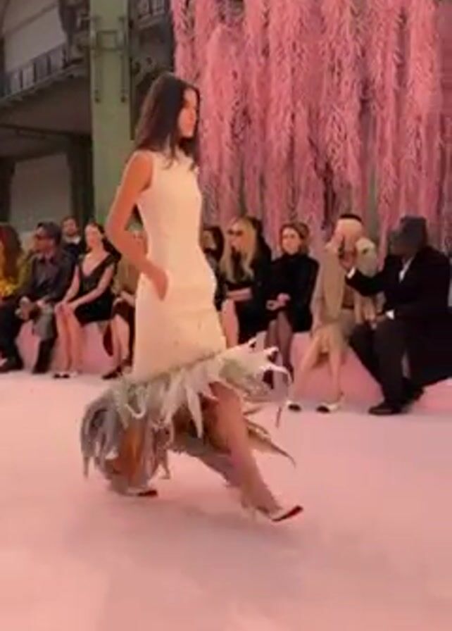 A model walks down a pink runway during a fashion show. She wears a light-colored, sleeveless dress with embellishments around the bodice. At the bottom of the dress, layered fabric in shades of gray, brown, and white, along with feathery accents, create a textured hem that moves as she walks. The model's shoes are light-colored with red accents. The audience sits on both sides of the runway, watching the model. Behind the audience, pink, faux weeping willows are on display. The location appears to be an indoor event space with vaulted ceilings.