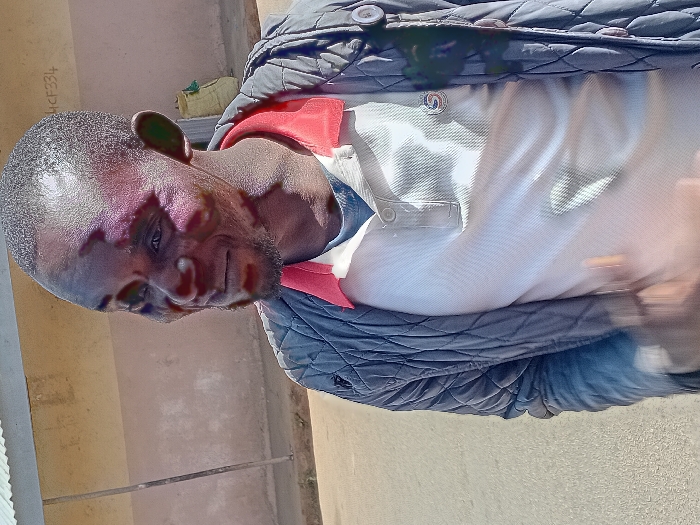 The image displays an adult male outdoors in what appears to be daylight conditions. The man has dark skin, short dark hair, and short facial hair. Distinctive raised, purplish-red scar tissue or markings are visible on the left side of his face, affecting his cheek, forehead, and temple. He is observed wearing a dark gray quilted jacket, open, over a red-collared polo shirt. Beneath the polo, a lighter-colored, possibly off-white or light beige, collared shirt is visible, featuring two buttons at the collar and a circular logo on the upper right chest area. His right hand is partially visible and slightly blurred in the lower center of the frame. The man's body is oriented slightly to the right, while his head is turned to the left, directing his gaze off-camera. The background consists of a weathered, light-colored building wall with a visible roofline. Faint alphanumeric characters "HCF334" are discernible on the wall above the man's right shoulder. A light-colored sack or bag is situated against the building wall to the right. The foreground shows a paved surface, likely asphalt. This scene is located in the city of Jos, Nigeria.