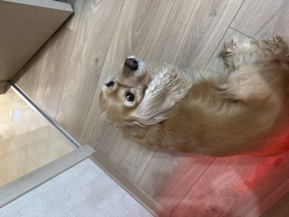 In an interior setting in Burgas, Bulgaria, a golden-brown Cocker Spaniel dog is depicted reclining on a light-colored wooden laminate floor. The dog's head is turned to its right, with its dark eyes focused upwards and towards the viewer's right, exhibiting an alert gaze. A textured light-colored wall borders the left side of the frame. In the background, a doorway opens to an adjacent area featuring a glossy, light-colored tiled floor. A distinct red light source casts a prominent red illumination on a portion of the wooden floor in the lower left quadrant of the image.