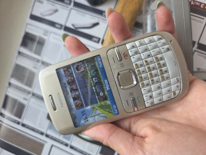 - "A left hand with fingernails painted light green holds a champagne-colored Nokia cell phone featuring a full QWERTY keypad" by FM-iqsQ12, licensed under CC BY 4.0