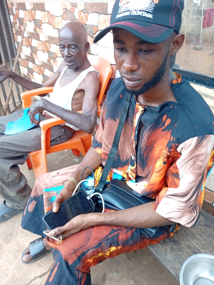 Two people sit outside on a sunny day. An older, frail man in a white tank top is in an orange plastic chair, holding a blue object. Next to him, a younger man with a beard wears a baseball cap and a colorful shirt. He holds a black smartphone in his hands with a charging cable attached. A black shoulder bag rests on his lap. They are seated near a metal bowl and a brick wall.