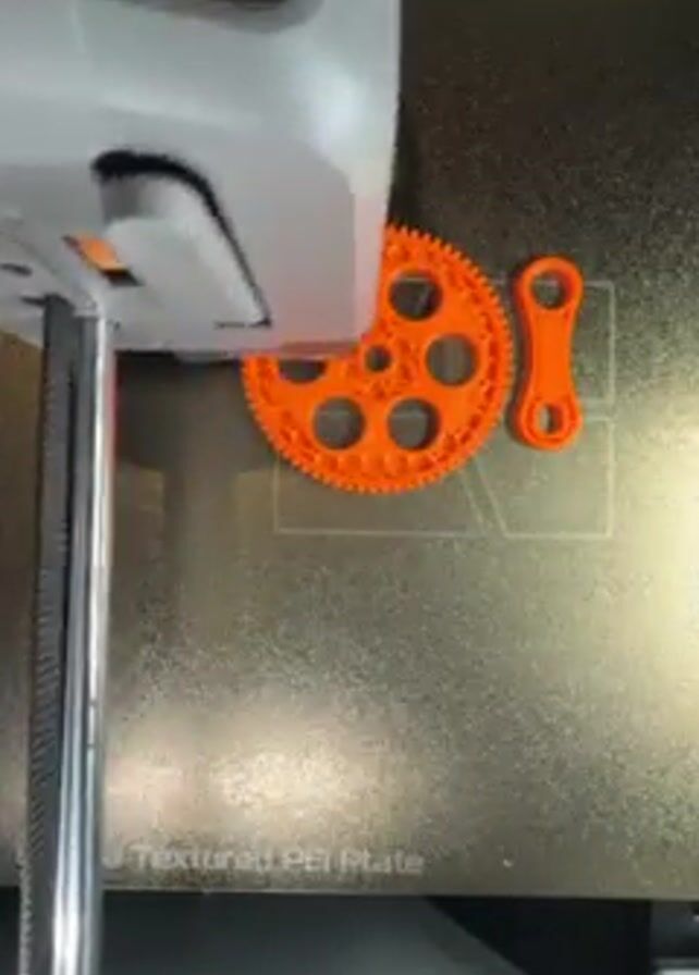 n overhead shot of a 3D printer at work. Two orange plastic parts, a gear and a small link, are already printed on the textured bed of the printer. The printer head moves above them, presumably working on a new layer. The frame is composed such that the printing process is the focal point.