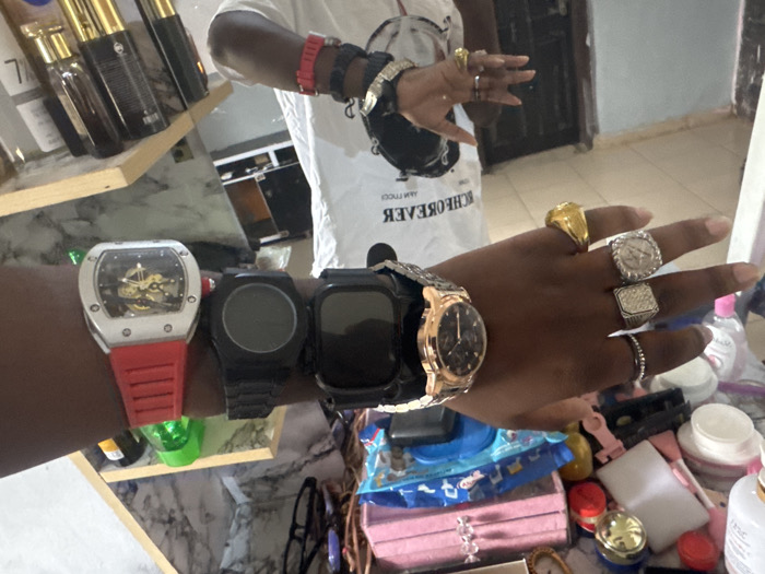 This image, taken in Asipa, Nigeria, depicts a dark-skinned arm and hand heavily adorned with multiple watches and rings, positioned horizontally across the frame