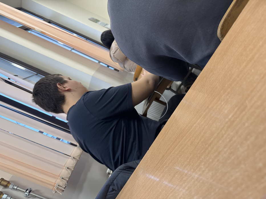 The image displays an indoor scene identified as a classroom or educational setting in Stara Zagora, Bulgaria. Three individuals are visible, seated at wooden desks. In the foreground, the lower left quadrant is occupied by the back of a person wearing a dark blue sweatshirt. To the mid-left, a male subject is seated facing away from the camera, viewed from the back and right side. He possesses short, dark hair and wears a dark blue short-sleeved t-shirt. His right arm rests on a wooden desk, and a white cable is visible descending from his lap area. To the mid-right, another individual is seen from the back, wearing a light-colored, possibly beige, puffy jacket while seated at a desk. The background features light-colored walls, exposed metal piping in the upper left corner, and multiple windows fitted with vertical, light-colored blinds. Some blinds are parted, revealing an exterior view of blue sky. No direct interactions between the subjects are depicted. All individuals appear to be engaged with their respective desks.