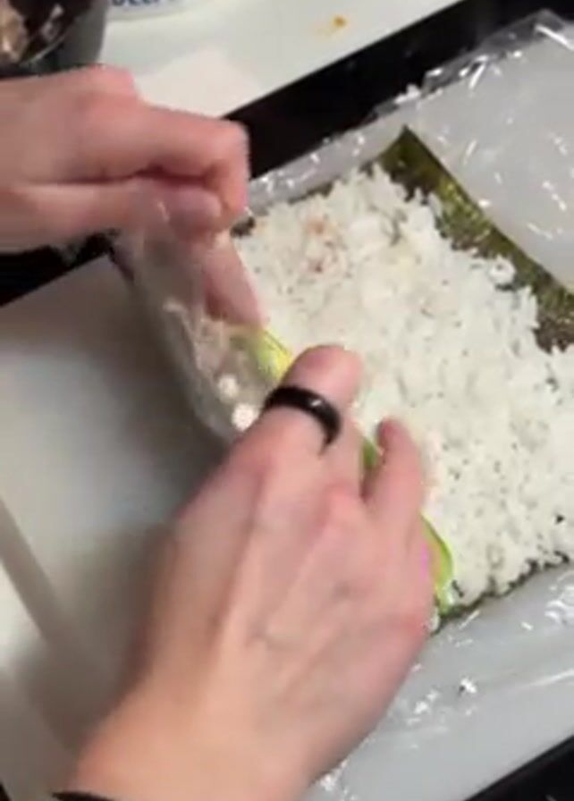 pair of hands making sushi