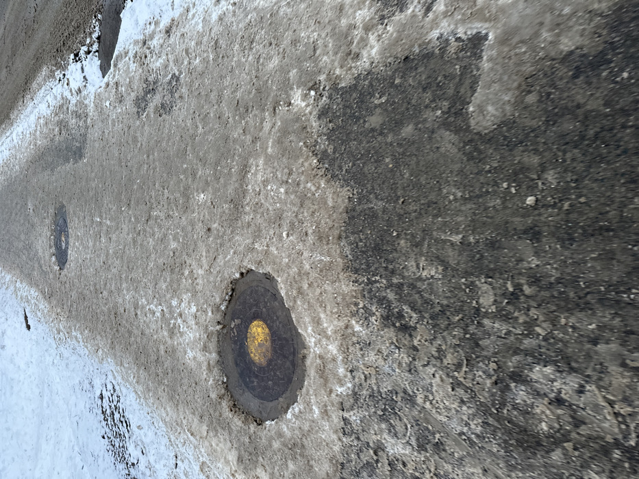 A close-up shows a road partially covered in melting snow and ice. Two circular manhole covers are visible, one closer with a golden center reflecting light. The road surface transitions from a snowy, icy texture to dark, exposed asphalt. The overall impression is of a winter scene with thawing conditions.