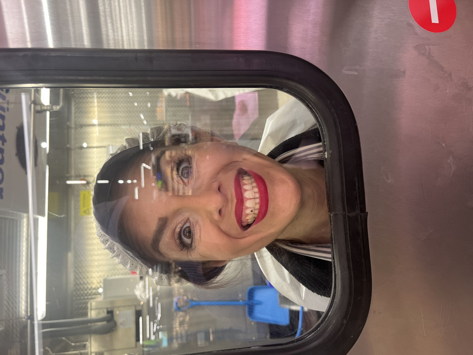 An adult female is depicted in a close-up, frontal view, peering through a rectangular glass window set within a metal door or wall panel. The scene is located within a commercial establishment, likely a food preparation area or supermarket, in Mensdorf, Luxembourg. The subject, exhibiting a wide, open-mouthed smile, has her eyes wide open and looks directly towards the viewer. She wears a white, pleated hairnet covering dark hair, a white uniform coat over a striped garment, and dark undergarment visible at the neck. Bright red lipstick is applied to her lips, and a small, dark speck is visible on her upper right incisor. Reflections of overhead lighting appear as vertical streaks and dots on the glass panel. The background visible through the glass indicates an industrial setting with stainless steel walls and surfaces. A blue dustpan or shovel is visible on the left side of the background. A yellow sign is partially visible in the upper background. To the right of the window frame, on the metal surface, a red circular sign with a white horizontal bar is partially visible, indicating a "No Entry" or similar restriction.