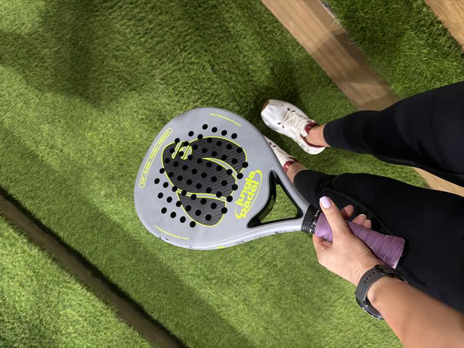 - "A first-person, downward-angle shot depicts an individual standing on a green artificial turf playing surface, holding a padel racket" by FM-9pZBm2, licensed under CC BY 4.0