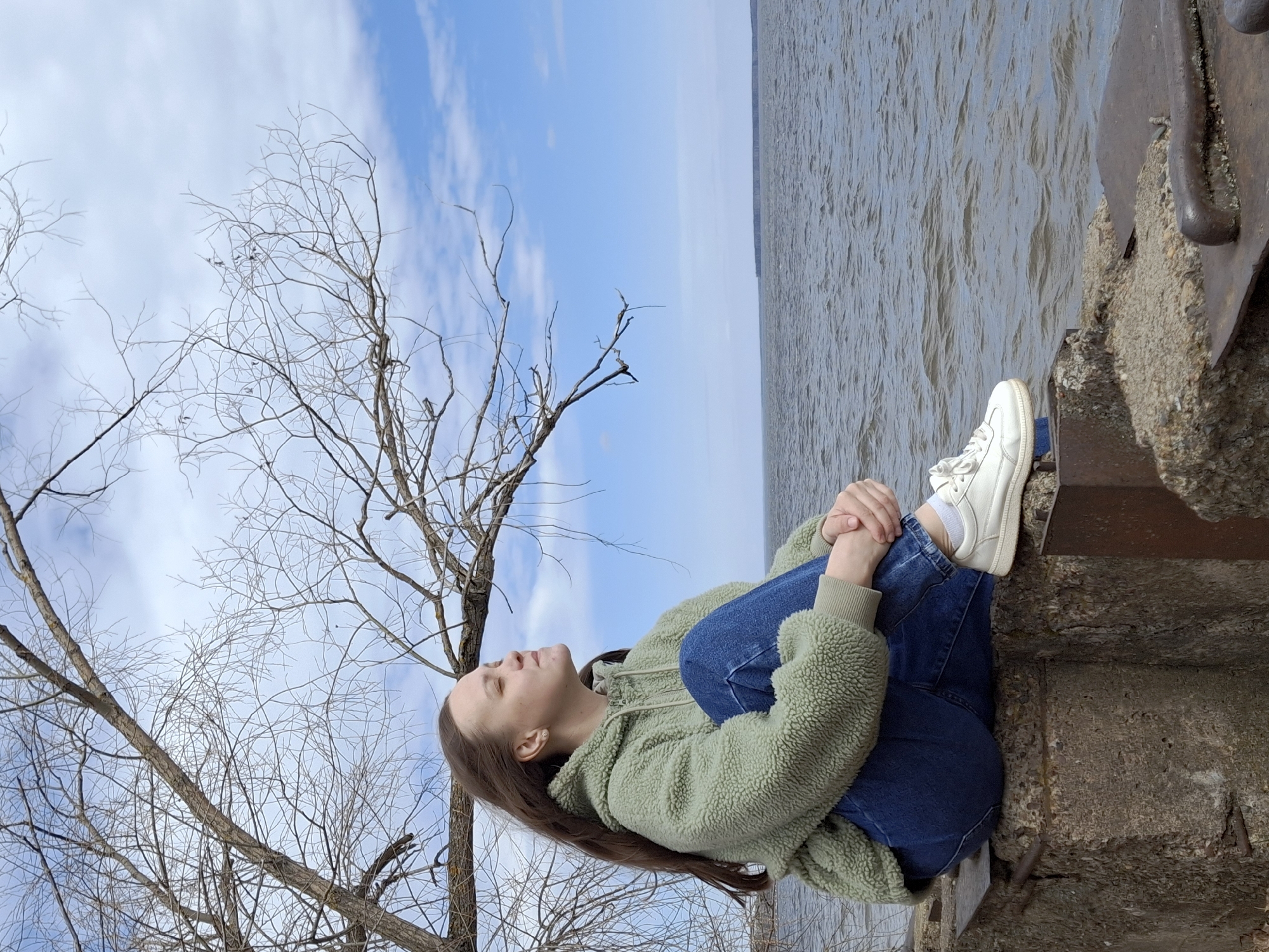 A young woman is sitting on a concrete and metal structure next to a body of water. The scene appears to be in Chaikovsky, Russia, based on the location attributes. She is wearing a green hooded fleece jacket, dark blue jeans, white socks and white sneakers. She is holding her knees, and her face is tilted upwards. A bare tree with many thin branches extends from the left side of the frame, reaching into a blue sky with wispy clouds. The body of water is wide, stretching horizontally across the background. The photograph is taken at a tilt.