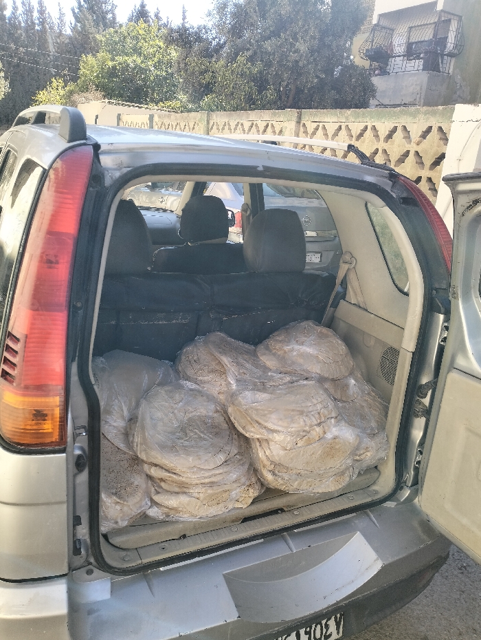 This image depicts the rear view of a silver-colored SUV, likely a crossover, with its tailgate open, in قرية الضبية, Syria. The cargo area of the vehicle is completely filled with numerous stacks of flatbread, each individually wrapped in clear plastic bags. The rear seats appear to be folded down or absent to accommodate the extensive cargo. The vehicle displays visible red and amber taillights on its left side and has roof rails. A partial Syrian license plate, ending with the digits "٦٩٥٤", is visible on the lower section of the rear bumper. The scene is outdoors during bright daylight. In the background, lush green trees and bushes are prominent, behind which a concrete wall with a decorative pattern is visible. Further back and higher, portions of a building with dark, cage-like structures (potentially security grates or balconies) can be seen. No individuals are present or engaged in any activity within the frame.