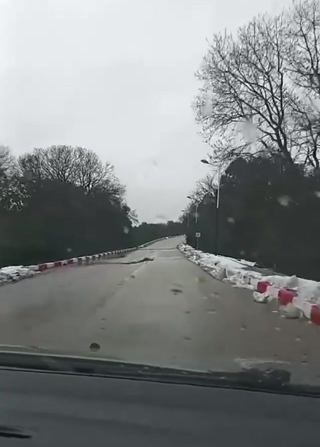car driving on a wet, slightly snowy road lined with trees on either side. The sky is overcast and gray. The road is paved and has red and white safety barriers on the sides. There are puddles on the road and patches of snow near the barriers. The camera is positioned inside the car, looking forward through the windshield. The windshield wipers are not running. A song is playing in the background.