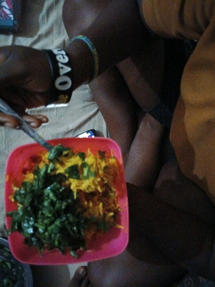 A person sits cross-legged on a beige surface, possibly a bed or floor. They are holding a red plastic bowl containing a mixture of yellow and green food. A fork is poised above the food. The person wears two wristbands, one black with white lettering that reads "Over", and the other a beaded string. The background is dark and out of focus.