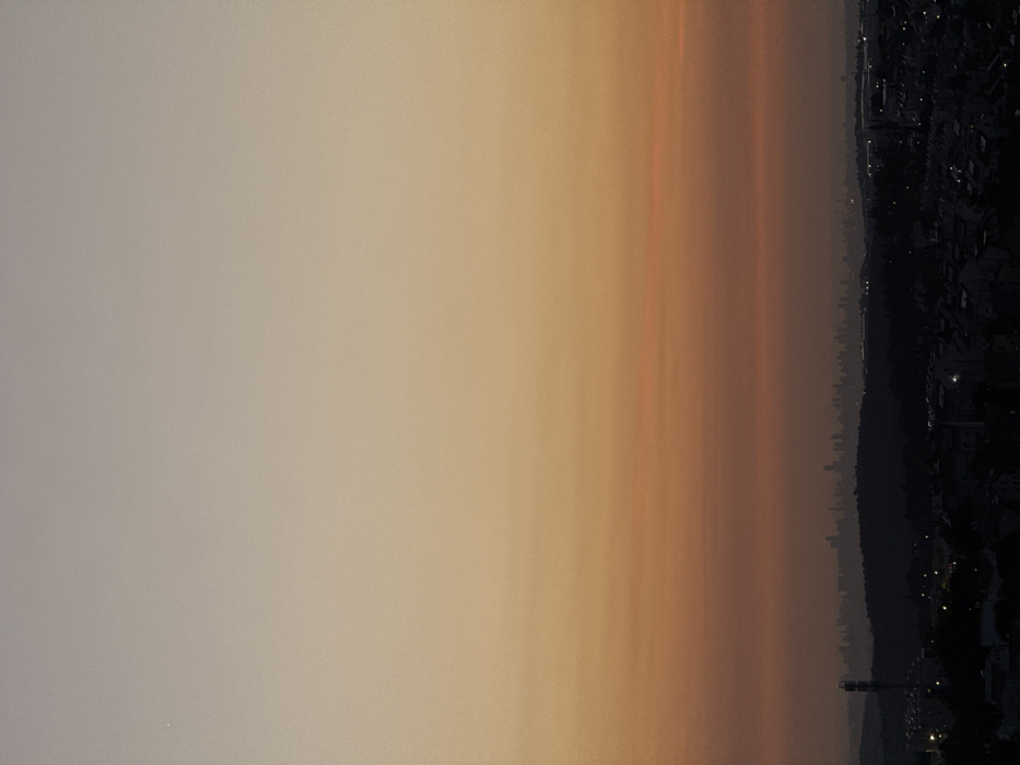 An elevated, wide-angle view captured at twilight depicts a landscape over the city of Ariel, Palestinian Territory. The sky occupies the upper two-thirds of the frame, exhibiting a gradient transition from pale grayish-orange at the top to a deeper orange and reddish-brown closer to the horizon, with subtle horizontal atmospheric bands visible. A single bright celestial point is present in the upper left. A distant, dark silhouette of an urban skyline is visible along the central horizon line. Below this, a darker, undulating terrain of hills and trees forms the midground. The foreground showcases a residential area within Ariel, characterized by dark building rooftops and visible artificial lights from streets and structures. On the left side of the foreground, a tall, dark communication tower stands against the illuminated sky.