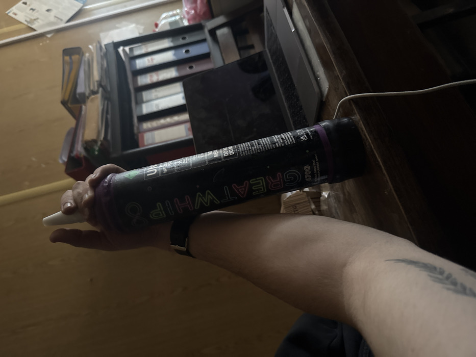 This image depicts an indoor scene, likely a cluttered room such as a home office or study, located in the city of Unknown, Unknown. A person's right forearm and hand are prominent in the foreground, holding upright a large, black and purple cylindrical canister. The canister is labeled "GREAT WHIP 8" in vibrant text and indicates "NITROUS OXIDE N2O 670G FOR FOOD PURPOSES ONLY." A white dispensing nozzle protrudes from the top of the canister. A black wristwatch with a silver buckle is visible on the person's wrist, and a dark feather-like tattoo is present on the inner forearm near the elbow. The background features a wooden desk upon which a silver laptop is open, its screen dark. A white charging cable extends from the laptop towards the lower right. Behind the desk, a dark shelving unit contains multiple binders of various colors (red, grey, blue) and numerous stacks of papers. A transparent plastic bottle is also visible on the shelf. A window is partially visible on the far right, providing some natural light, but the room is predominantly illuminated by a warm, yellowish light source from the left side of the frame, casting shadows. The walls appear to have light-colored, possibly paneled, surfaces.