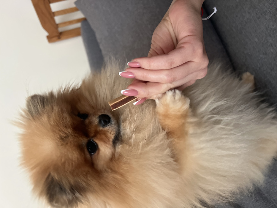 The specific location in the city of Sofia, Bulgaria, cannot be determined from this image. The scene depicts an indoor, domestic setting. A fluffy, light brown and tan Pomeranian dog occupies the left and central portion of the frame, sitting upright. Its attention is directed towards a bicolored, rectangular, stick-shaped object held by a human hand. The dog's dark eyes are focused on this object. Its front left paw is positioned on or near the palm of the human hand. The human hand, visible on the right, belongs to an individual with long, oval-shaped fingernails featuring a pink base and white French tips. The hand holds the bicolored object, which appears to be a dog treat, with its fingers. A thin white string or band is present on the wrist of the human hand. The immediate background includes a plain, light-colored wall on the left and a dark gray fabric surface, likely a sofa or cushion, spanning the right side behind the dog and hand. A partial view of a light-colored wooden chair back with vertical slats is visible in the upper right corner. The lighting is even, suggesting an interior light source.