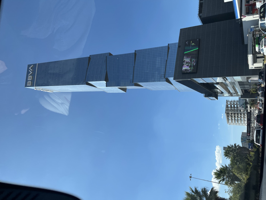 A modern, angular building with a glass facade and the "BBVA" logo dominates the scene against a clear blue sky. The building is segmented into multiple stepped sections. Adjacent to it is a dark building with a large digital display. Below, palm trees and streetlights line the road. In the background, other buildings are visible, and cars are seen on the road.